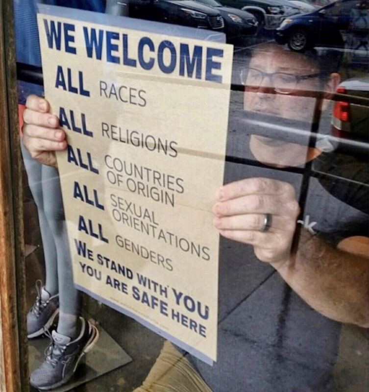 - Signage. Adams installed posters in her store windows that say: “We welcome all races, all religions, all countries of origin, all sexual orientations, all genders. We stand with you. You are safe here.”