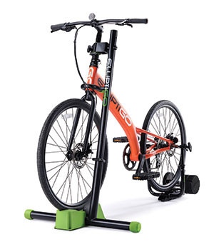 Designed from the ground up to provide a stationary training experience for all ElliptiGO bikes, the Stationary Trainer includes a front stand that holds the bike upright by attaching to the steering column and supporting the front wheel, and a resistance unit that attaches to the rear wheel of the bike and allows the bike to pivot side to side.