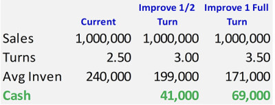 What does this tell us? It tells us that a store making $1 million in sales per year, turning their inventory 2.50 times, could find $41,000 in cash if they improved their turns by a half turn. It means that they could generate more cash without having to sell more!