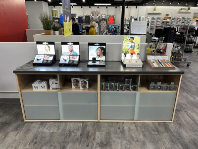 For the tech or electronics category, we often design a custom cabinet display with hidden storage below for backstock inventory. Then we drill some holes on the top of the counter and run the charging cords down to the hidden power access. This presentation keeps things clean and streamlined, while creating an irresistible opportunity for your customers to give the products a try. The size of the cabinet or bar counter can be determined entirely by what the size your store will allow, but even a small hands-on display will be more enticing than keeping it all in the box.